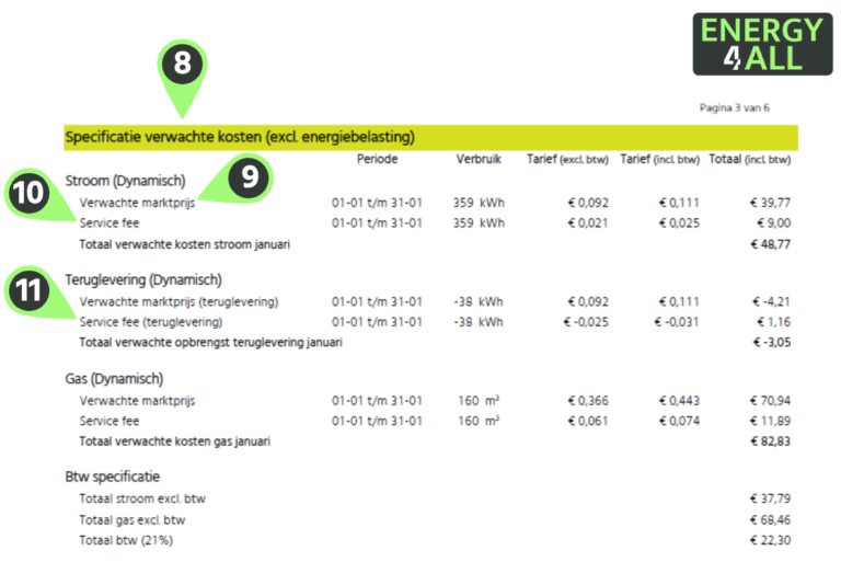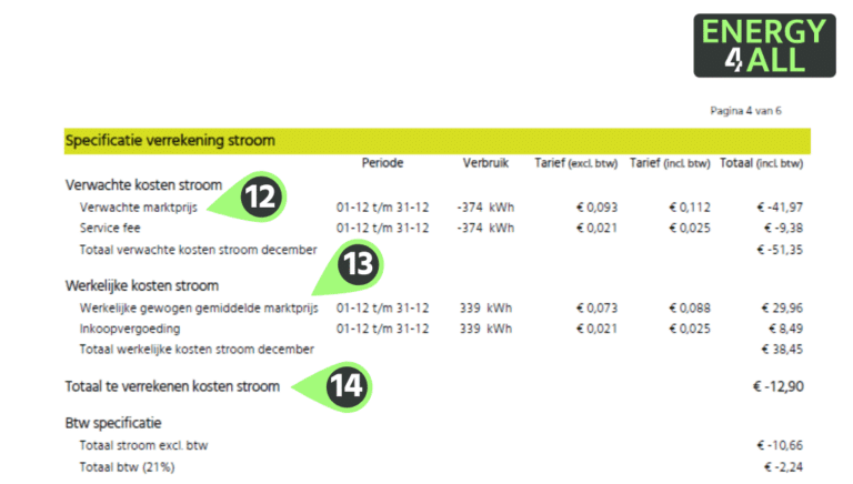 Bij verwachte kosten staat het deel dat we vooraf (op een eerdere factuur) hadden ingeschat voor de betreffende maand. Dat deel wordt hier volledig tegengeboekt. Wat resteert zijn de ‘Werkelijke kosten’. Dat is het daadwerkelijke verbruik voor deze maand. Het tarief dat hier getoond wordt is een gewogen gemiddelde.